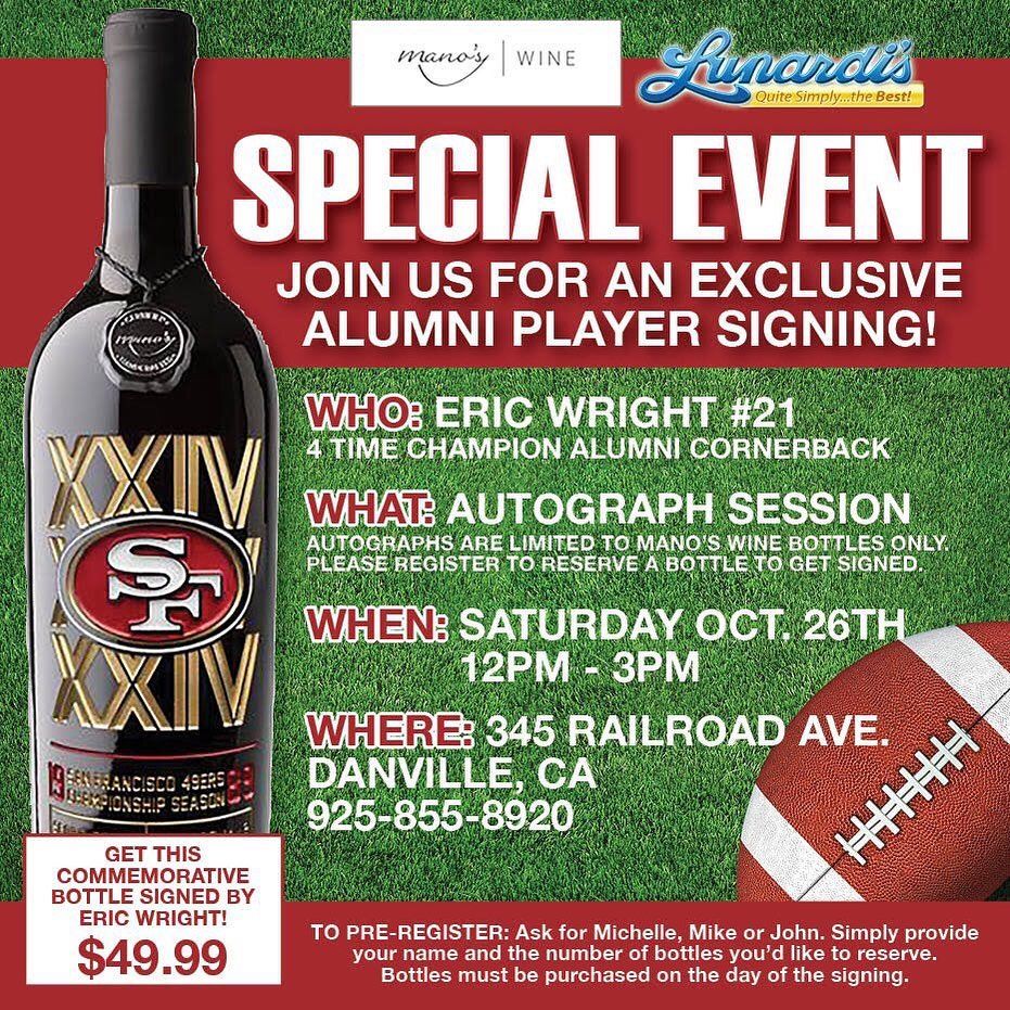 Details: 4x Champion cornerback will be signing commemorative 49er bottles from Mano’s wine at the Danville location, Saturday October 26th from 12-3pm. Call today to reserve your bottle.