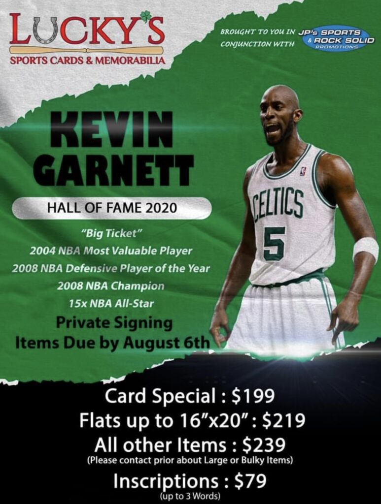 This is a PRIVATE AUTOGRAPH EVENT and you would need to send in your item(s) directly to the promoter to get signed. I will NOT be taking items or attending this event. The Event is being thrown by Lucky’s Sports Cards & Memorabilia. Simply sharing the information to my follows in case they needed Kevin Garnett in their collection. To place your order, click on link and it will bring you to the promotors website.