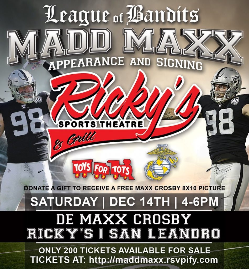 This is also a Toys for Tots event. Donate a gift and receive a FREE 8×10 Photo of Maxx Crosby.