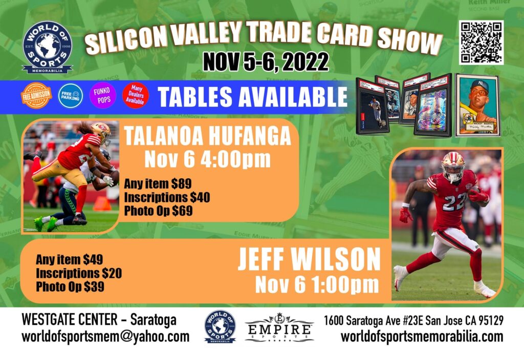This will be a PUBLIC SIGNING, so come see Hufanga and Jeff Wilson Jr and get their autograph IN PERSON. Purchase your tickets at the store now or the day of the event. Any questions regarding this event, you can reach out to them directly at worldofsportsmem@yahoo.com or 408-286-2151